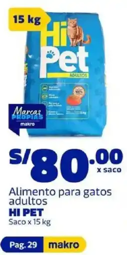 | Hi Pet alimento para gatos adultos 15 kg | Makro | S/ 80.00 | 06 noviembre 2025 | 20 noviembre 2025 | |||
