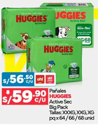 | Pañal Active sec HUGGIES Big pack Tallas: XG / XXG / XXXG pq x 64 / 66 / 68 unid | Plaza Vea | S/ 59.50 | 26 mayo 2023 | 01 junio 2023 | |||